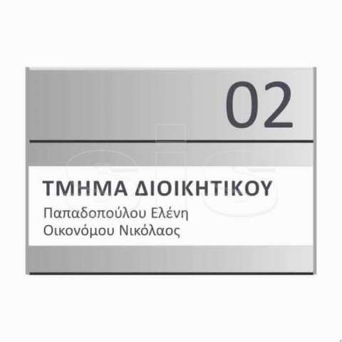 Κατόπιν παραγγελίας Τυποποιημένη πινακίδα με υποδοχή εκτύπωσης. Αποτελείται από προφίλ αλουμινίου το οποίο δέχεται συρταρωτά χαρτί που τυπώνεται σε οποιοδήποτε εκτυπωτή, ζελατίνη και δύο εξαρτήματα τελειώματα από PVC. Πάνω στο προφίλ υπάρχει η δυνατότητα να υπάρχει αρίθμηση ή λογότυπο ενώ στο χαρτί τυπώνονται τα πλέον ευμετάβλητα στοιχεία. Το χαρτί εγγραφής είναι ύψους 75mm. Τοποθετούνται στην είσοδο των τμημάτων κατά προτίμηση δίπλα από την πόρτα για να είναι ορατές όταν οι πόρτες είναι ανοικτές σε εμφανές σημείο στο ύψος του ματιού. Η στήριξη γίνεται στα τελειώματα από PVC εσωτερικά με upat ή ταινία διπλής όψης ενώ πάνω στα πλευρικά τελειώματα κουμπώνει η πινακίδα εγγραφών. Στη βασική μορφή το χρώμα της πινακίδας είναι ασημί στο φυσικό χρώμα του αλουμινίου ενώ τα πλαστικά στα άκρα είναι μαύρα ή γκρι ανοικτό.