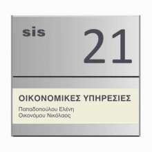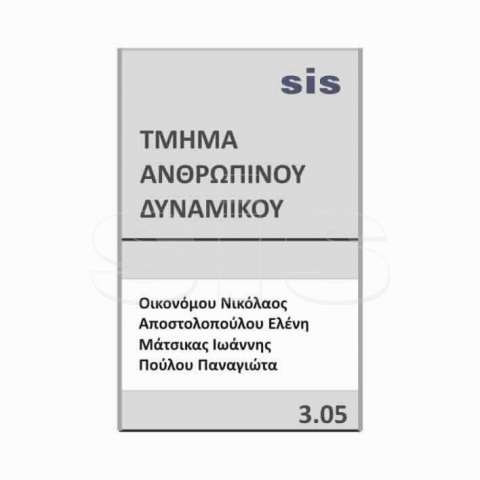 Κατόπιν παραγγελίας Τυποποιημένη πινακίδα με υποδοχή εκτύπωσης. Αποτελείται από προφίλ αλουμινίου το οποίο δέχεται συρταρωτά χαρτί που τυπώνεται σε οποιοδήποτε εκτυπωτή, ζελατίνη και δύο εξαρτήματα τελειώματα από PVC. Πάνω στο προφίλ υπάρχει η δυνατότητα να υπάρχει αρίθμηση ή λογότυπο ενώ στο χαρτί τυπώνονται τα πλέον ευμετάβλητα στοιχεία. Το χαρτί εγγραφής είναι ύψους 75mm. Τοποθετούνται στην είσοδο των τμημάτων κατά προτίμηση δίπλα από την πόρτα για να είναι ορατές όταν οι πόρτες είναι ανοικτές σε εμφανές σημείο στο ύψος του ματιού. Η στήριξη γίνεται στα τελειώματα από PVC εσωτερικά με upat ή ταινία διπλής όψης ενώ πάνω στα πλευρικά τελειώματα κουμπώνει η πινακίδα εγγραφών. Στη βασική μορφή το χρώμα της πινακίδας είναι ασημί στο φυσικό χρώμα του αλουμινίου ενώ τα πλαστικά στα άκρα είναι μαύρα ή γκρι ανοικτό.