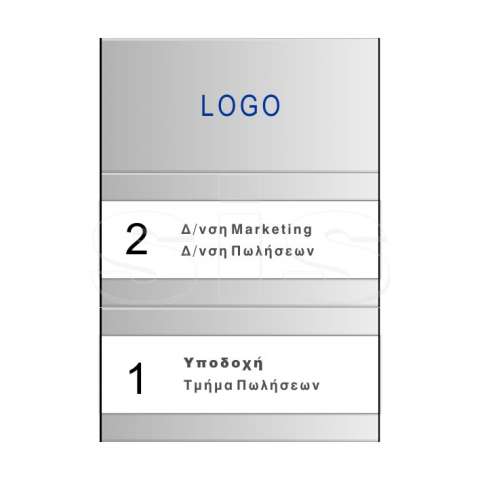 Κατόπιν παραγγελίας Standard sign with receptor for printouts. It is made of an aluminum profile which accepts sliding paper, printed by any printer, gelatin and two PVC end parts. A number or a logo can be placed on aluminum profile, while the most variable elements are printed on the paper. The paper is 75mm high. The support is made with upat, placed within the sign, or double-sided tape, while on the side ends the registration sign is linked. At the basic selection the sign is silver, the natural color of the aluminum, while the plastic on the edges is black or light gray.