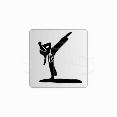 The sign is made of aluminum sheet in its natural color silver, and is 1mm thick. It has at its perimeter a double-sided tape, on the back side, for easy placement on a wall, door or other surface. At its four edges the corners are rounded. The graphics are in black (other basic colors are also available on demand).