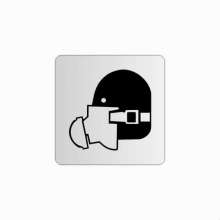 The sign is made of aluminum sheet in its natural color silver, and is 1mm thick. It has at its perimeter a double-sided tape, on the back side, for easy placement on a wall, door or other surface. At its four edges the corners are rounded. The graphics are in black (other basic colors are also available on demand