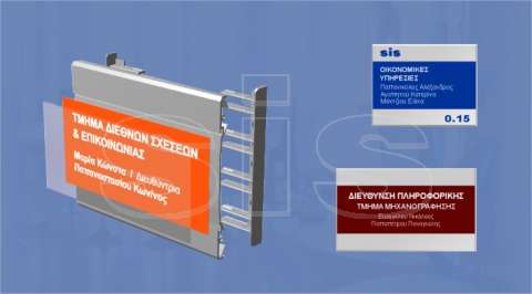 Available on order Standard sign with receptor for printouts. It is made of an aluminum profile which accepts sliding paper, printed by any printer, gelatin and two PVC end parts. A number or a logo can be placed on aluminum profile, while the most variable elements are printed on the paper. The paper is 75mm high. The signs can be placed at the entrance of each department preferably next to the door to be visible at all times. The support is made with upat, placed within the sign, or double-sided tape, while on the side ends the registration sign is linked. At the basic selection the sign is silver, the natural color of the aluminum, while the plastic on the edges is black or light gray.