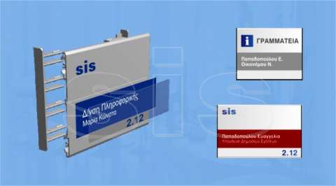 Available on order Standard sign with receptor for printouts. It is made of an aluminum profile which accepts sliding paper, printed by any printer, gelatin and two PVC end parts. A number or a logo can be placed on aluminum profile, while the most variable elements are printed on the paper. The paper is 40mm high. The signs can be placed at the entrance of each department preferably next to the door to be visible at all times. The support is made with upat, placed within the sign, or double-sided tape, while on the side ends the registration sign is linked. At the basic selection the sign is silver, the natural color of the aluminum, while the plastic on the edges is black or light gray.